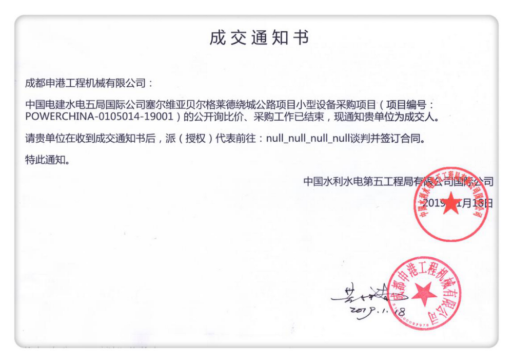 2019年1月18日,我公司收到中國電建水電五局國際公司發來的關于塞爾維亞貝爾格萊德繞城公路項目小型設備采購項目的“成交通知書”,我公司為成交人,目前該設備已用木箱包裝完畢,準備發往指定港口。