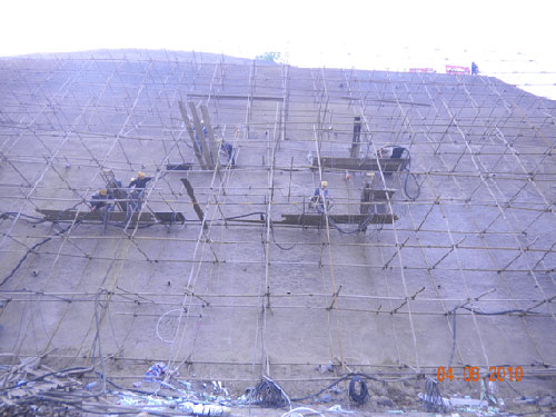 宜瀘渝高速公路南溪長江大橋建設是宜瀘渝高速公路宜賓段的控制性工程,2008年11月開工建設,預計2012年年底建成通車,投資為6.5億元,橋梁總長度1295.89米,主橋為820米,寬24.5米,橋梁形式為雙塔門式拉索橋,雙向四車道,設計時速為80公里,其北橋頭位于長江北岸南溪縣羅龍鎮金雞村王家嘴,南橋頭位于長江南岸南溪縣江南鎮和馬家鄉交界處的灌口。圖為GS20EC灌漿泵在錨碇基坑灌漿施工中。